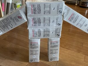 わが家でも最初は「工作=形を作る活動」でしたが、ある日、息子に「牛乳パックで何か作ってみよう」と持ちかけると、迷わずロボットを作り始めました。